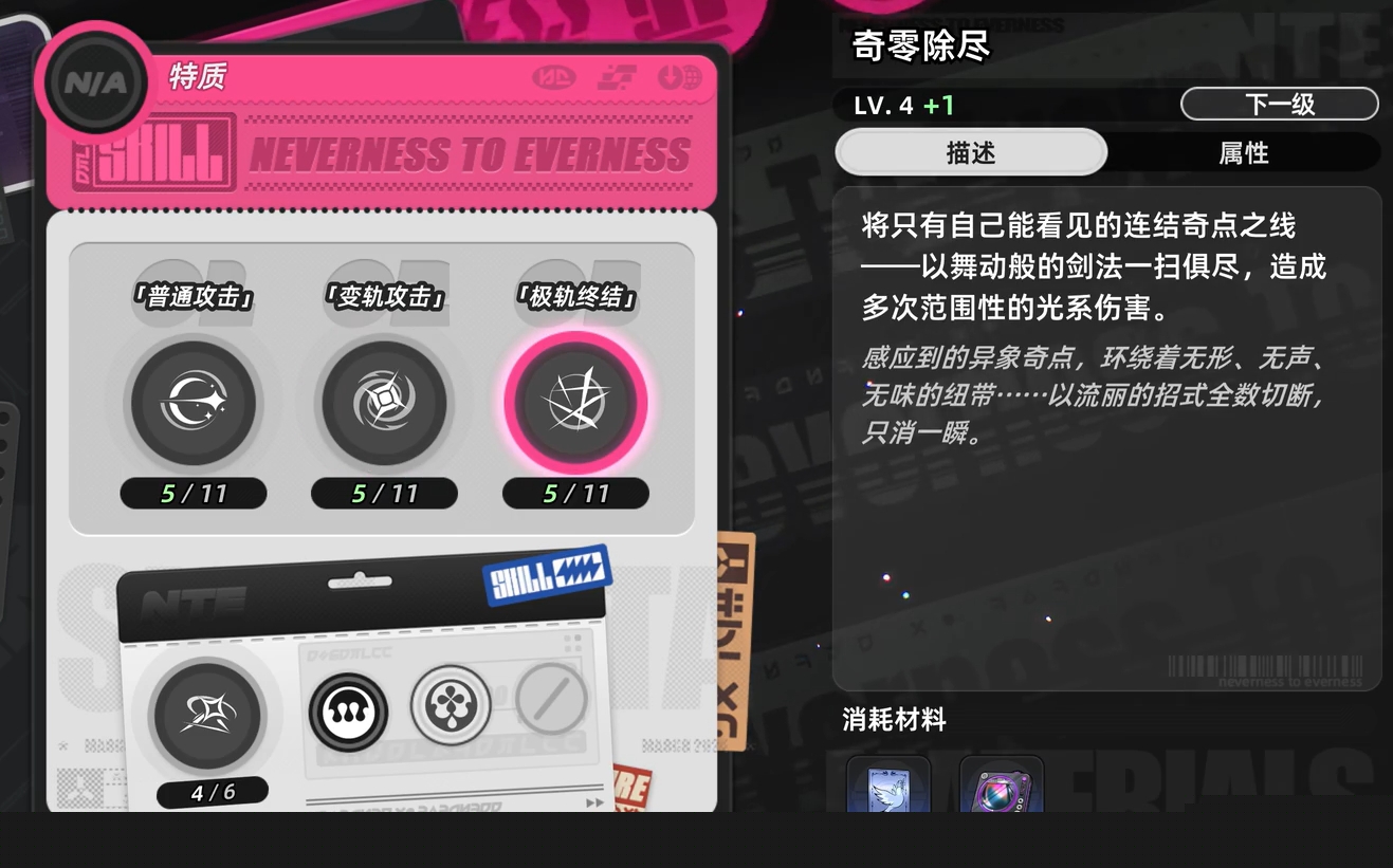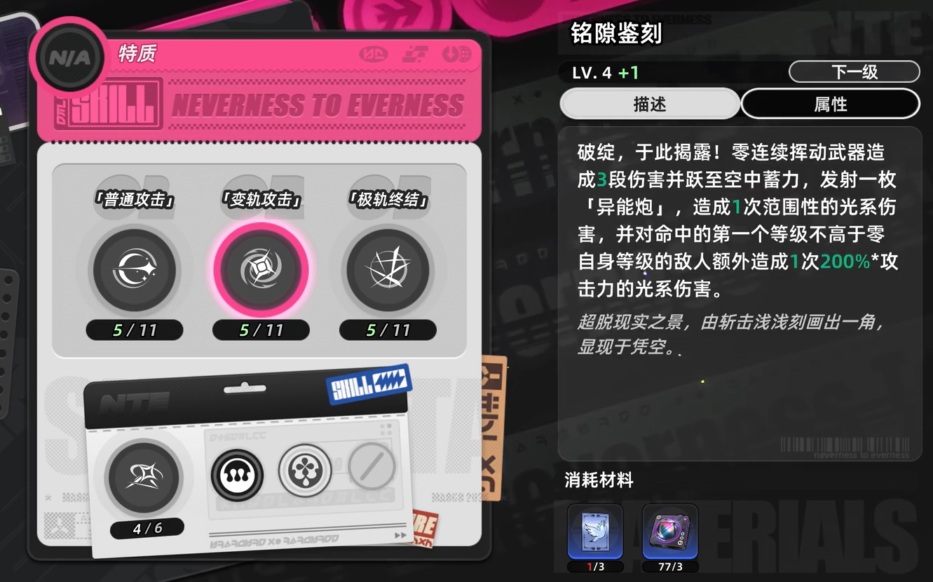 零的基础普攻共五段,具备环合系数积攒机制。其中第四、五段攻击倍率显著提升,建议在安全环境下尽可能打出完整连段以最大化输出效率。若遭遇压制或节奏被打断,则应优先采用闪避与弹反策略保障生存。空中普攻会触发重击下落效果,以落点为中心释放小范围光属性伤害;而精准闪避敌方技能后衔接普攻,可发动高倍率光系闪避反击,该机制在实战中高频使用,是零的核心输出节奏支点之一。