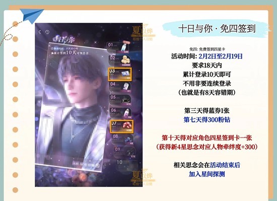 十日与你免四签到可得300粉钻。(升其他人物牵绊值注意)