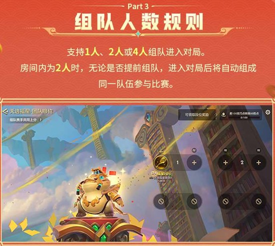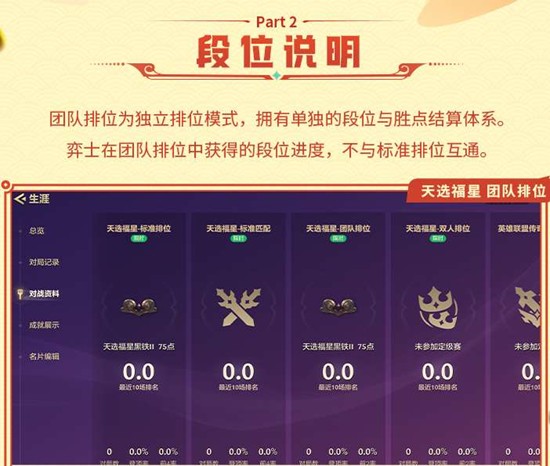 团队排位为独立排位模式,拥有单独的段位与胜点结算体系,弈士在团队排位中获得的段位进度不与标准排位互通。段位结构与同赛季标准排位保持一致,段位各自独立互不影响。组队人数支持1人、2人或4人组队进入对局,房间内为2人时无论是否提前组队,进入对局后将自动组成同一队伍参与比赛。