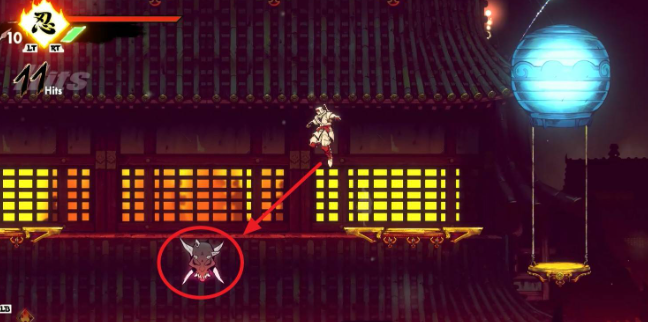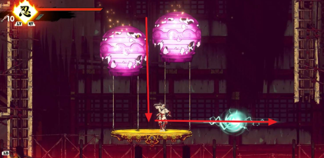 14、回到屋顶往右走,尽头跳到紫色灯笼上缓缓下落,底部会看到一个能量球,衔接能量球往右边平台冲