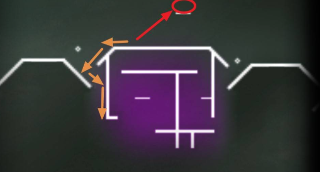 9、沿着下图黄色箭头绕到左侧墙壁,贴到左侧墙壁慢慢往下降
