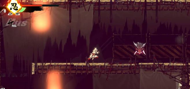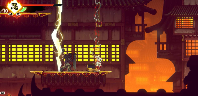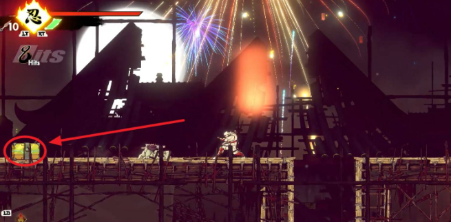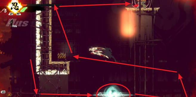 10、到达底部时直接往右边的能量球跳跃+翻滚移动到右下角平台,跳到半空扔手里剑把中间打远程的敌人干掉