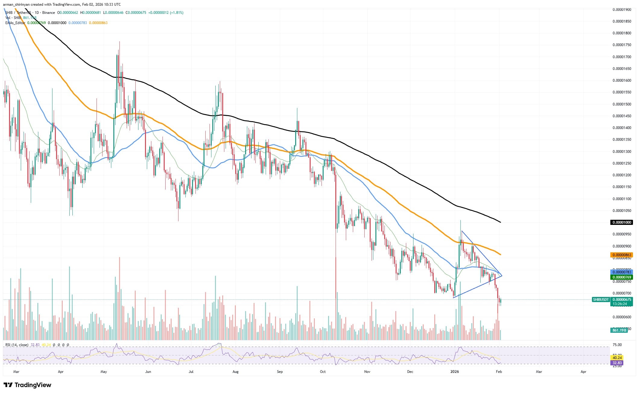 但目前价格走势仍不稳定,SHIB近期延续下跌趋势并跌破短期盘整形态,创下局部新低。该资产持续在关键移动均线下方交易,从技术面看整体趋势仍偏空。伴随近期下跌的成交量激增,印证了卖方主导市场。