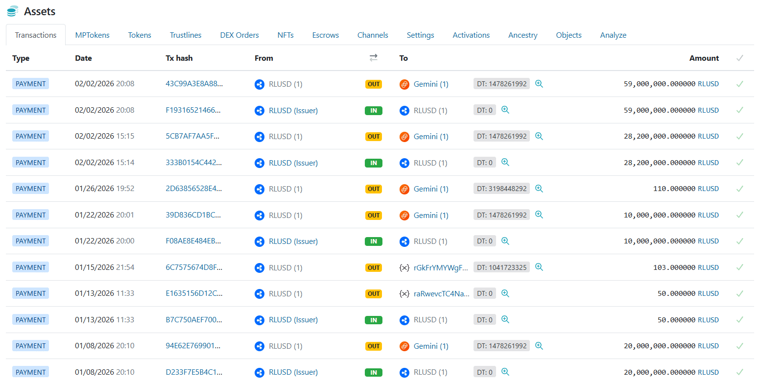 仅2025年内,系统已向XRPL部署1.952亿枚RLUSD,这些代币在铸造后悉数转入Gemini。Gemini于2025年5月上线RLUSD后便部署了对XRPL的支持,从而实现了近期资金流。