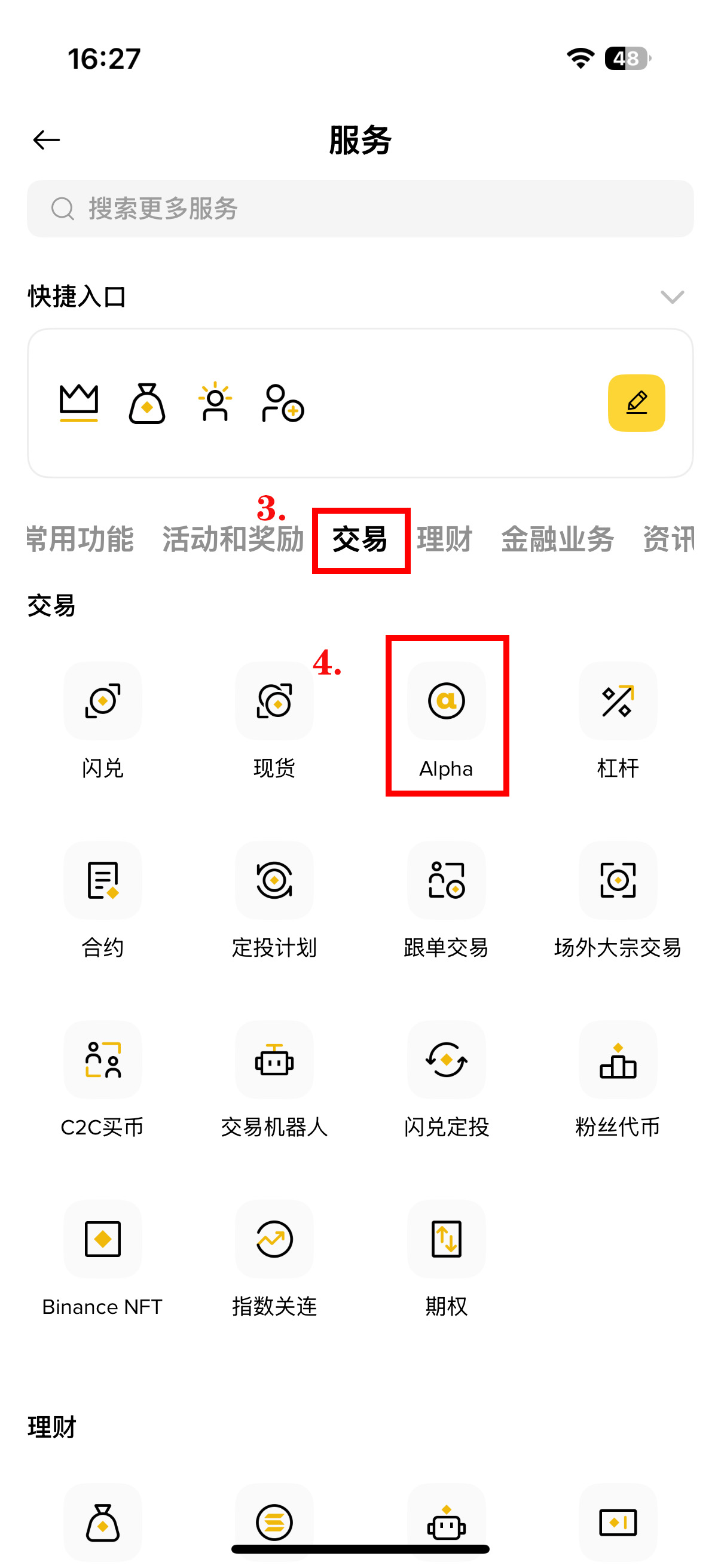 启动币安App后,有两种方式进入Alpha交易专区。第一种是通过首页顶部导航栏的「Alpha」标签直接进入;第二种是在首页点击「更多」选项,从交易分类中找到「Alpha」功能入口。