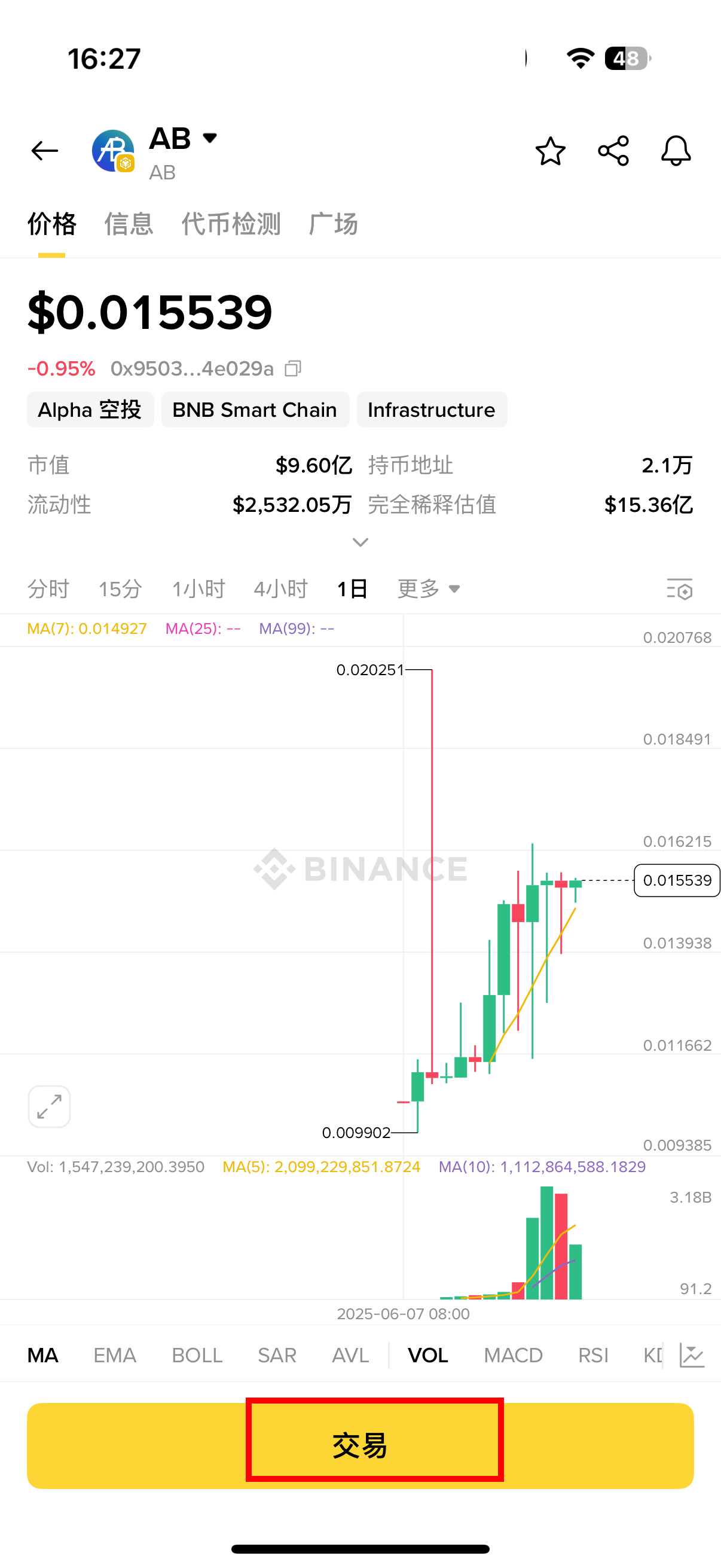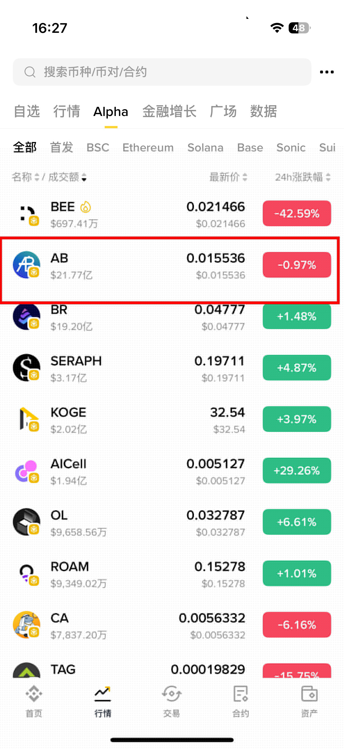 成功进入Alpha专区界面后,用户可自由选择需要交易的数字货币种类。本教程以$AB代币为例,点击对应币种卡片后选择「交易」按钮进入下一步。
