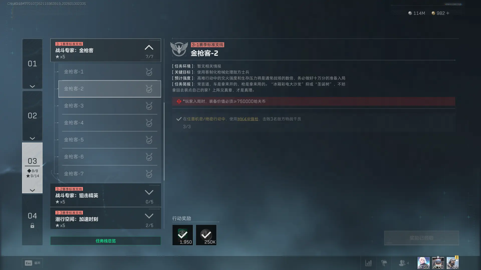 1、任务目标:在任意机密/绝密行动中,使用【MK4冲锋枪】,击败3名敌方特战干员。