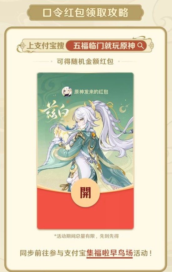 3. 福卡规则:2月3日集福正式开启后,早鸟卡自动转为原神主题福卡,助力快速集齐五福+主题卡开奖,超时未转换会作废