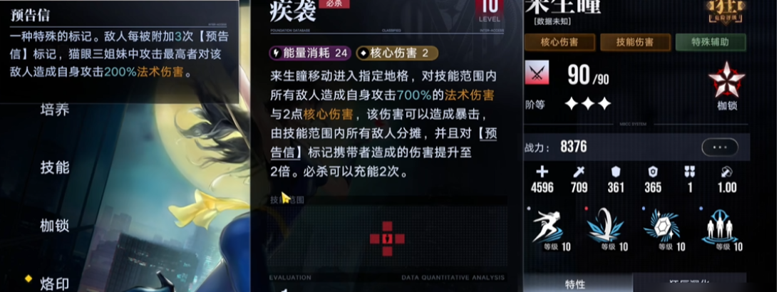 部分具备此机制的代表性角色包括联动活动中登场的猫眼三姐妹。来生瞳的必杀技疾袭可以充能2次,使她能够灵活位移并造成高额的范围法术伤害与核心伤害。作为团队核心输出兼辅助的大姐来生泪,其必杀技绮夜之约同样可以充能,在造成伤害与核心伤害的同时,还能生成提供持续控制与伤害的夜之帷幕力场。这些设计使得她们在联动作战中能通过连续释放必杀来主导战局节奏。