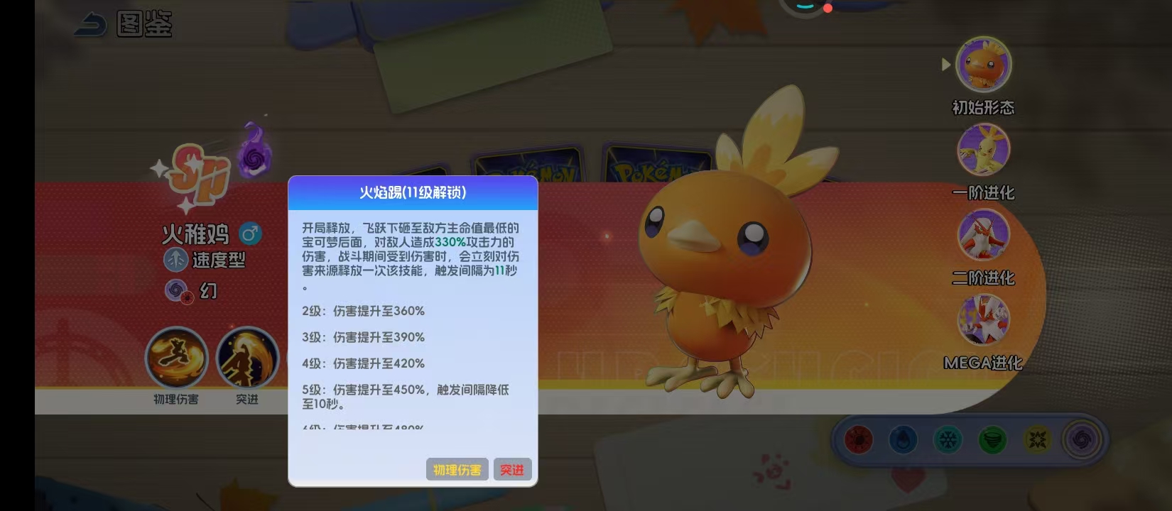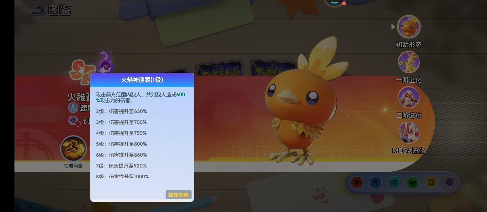 火焰神速踢——火稚鸡的初始主动技能,对前方扇形区域内的所有敌方单位造成物理伤害。基础伤害系数随技能等级提升呈阶梯式增长:1级时为600%攻击力,升至8级后提升至1000%攻击力。该技能不仅在中后期提供可观的范围爆发,前期亦能高效压制敌方整体血线;在多人协作战斗中,可配合控制类队友实现先手压制与连段衔接,形成稳定输出轴心。