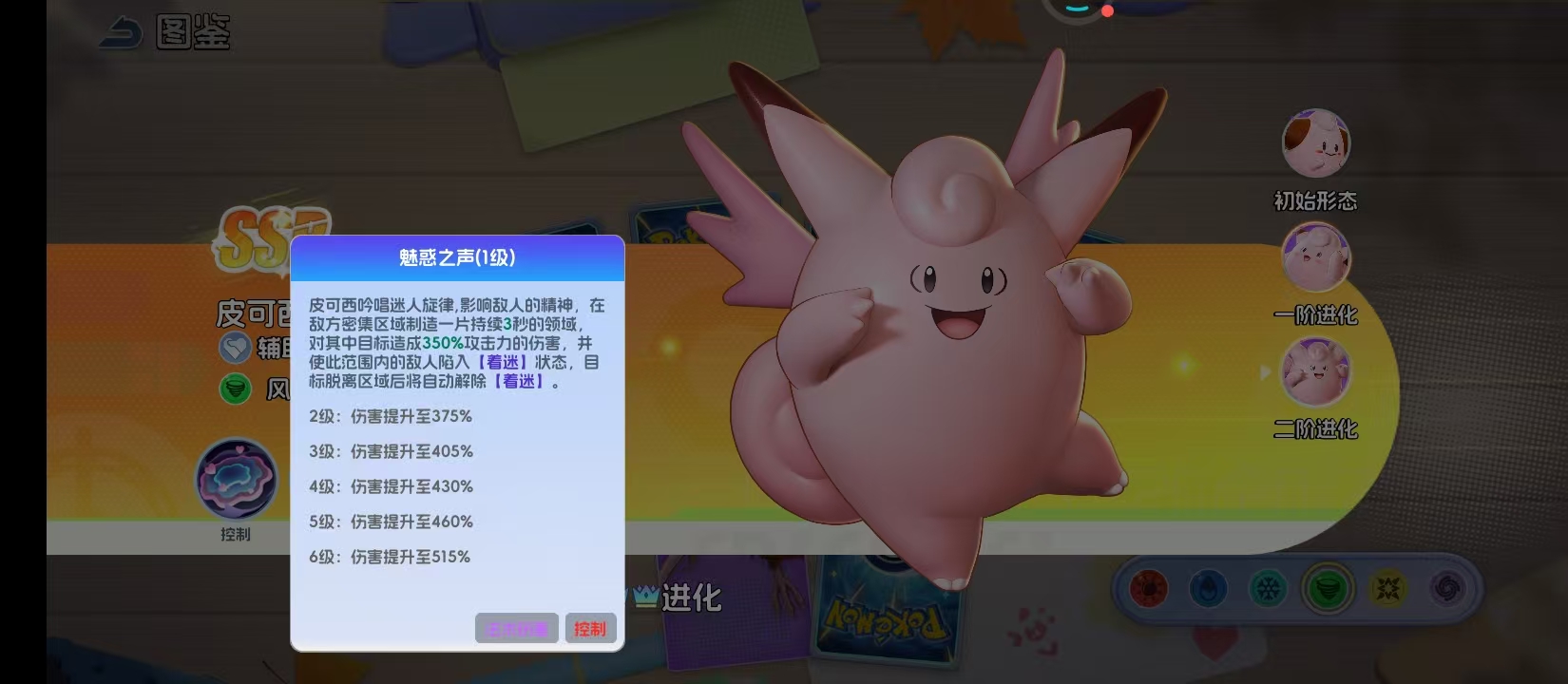 最终形态皮可西拥有粉色双翼,是风系辅助体系的完全体。核心技能“魅惑之声”为其标志性机制:释放后在敌方密集区域生成持续3秒的领域效果,对范围内目标造成高额伤害,并使其陷入“着迷”状态——该状态下单位将强制停止所有行动。一旦目标脱离领域范围,“着迷”效果立即解除,确保控制精准可控,大幅提升团战节奏调度能力与集火效率。