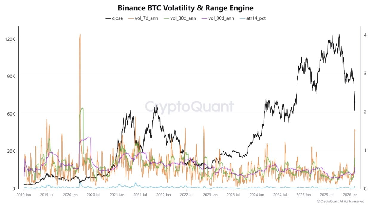 虽然比特币价格连日徘徊在7万美元下方,但分析师展示的图表显示,其七日年化波动率已飙升至约1.51,创下币安波动率指标自2022年以来的最高纪录。