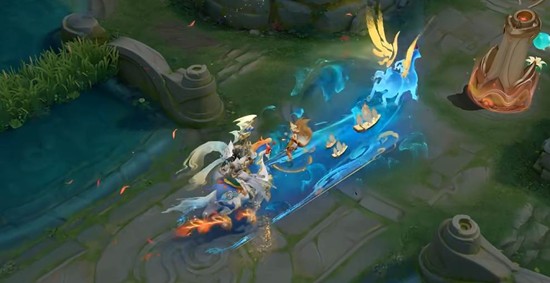 花灯和神环升起,浪花环绕脚下,映照出故乡的塔。冲锋状态时,关羽策马一跃,将惊涛巨浪卷入地面罗盘,为船只指明方向,自此山清海平。罗盘与海浪特效范围大且亮眼。