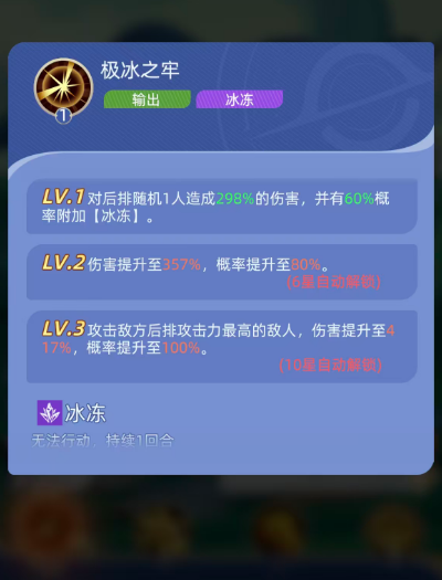 一技能【极冰之牢】是泰斯特拉的核心输出兼控制手段。初始效果为对敌方后排随机单体造成298%攻击力的冰属性伤害,并有60%概率施加【冰冻】状态——使目标跳过下回合行动。该技能随角色星级提升而显著强化:6星时伤害升至357%,冻结概率提升至80%;10星时进一步进化为锁定敌方后排攻击力最高者,伤害达417%,冻结概率100%,实现精准、必中、高伤的三重压制,是当前版本冰冻队破阵的关键启动技。