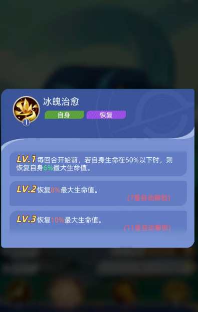 二技能【冰魄治愈】专注提升生存韧性。效果触发于每回合开始前,当泰斯特拉自身生命值低于50%时,立即恢复其最大生命值的6%。该回复量随技能等级提升而增强:7星解锁2级效果,回复量提升至8%;11星解锁3级效果,回复量达到10%。这一阶梯式成长设计,使其在中后期团战中具备持续站场与自我续航能力,有效缓解队伍治疗压力。