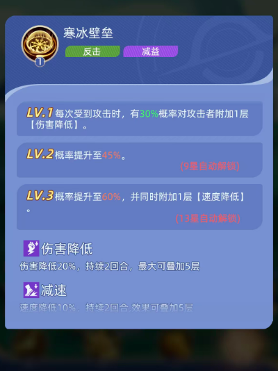 四技能【寒冰壁垒】是其最具策略深度的被动反击技。每当受到攻击时,有30%概率对攻击者施加1层【伤害降低】效果,使其后续2回合内造成的伤害减少20%,该效果最多叠加5层。技能经升级后,13星时概率提升至60%,并额外附加1层【速度降低】,使目标行动速度下降10%,持续2回合,同样可叠至5层。双减益叠加机制,使其在对抗高爆发或高速单位时具备极强反制力,与【极冰之牢】形成“主动控+被动压”的立体控制闭环。