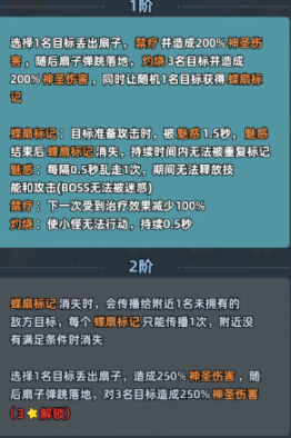 一技能为单体穿透+范围灼烧双效结构:投掷扇形武器对首个目标造成200%神圣伤害;扇子落地后触发范围溅射,对周围至多3名敌人额外施加200%神圣伤害,并随机赋予一名目标「扇标记」。该标记具备三层战术价值——当被标记单位进入攻击前摇动作时,强制触发1.5秒魅惑效果;同步施加禁疗状态,使目标在持续时间内无法获得任何治疗收益;且所有受灼烧影响的小怪将被定身0.5秒。需注意:该技能对Boss类单位不生效,属明确设计为清杂与控场服务的专项技能。