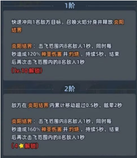 二技能为阶段式结界压制技:初始形态下突进并展开火焰领域,对范围内最多8名敌人造成击飞+120%神圣伤害,并附加持续灼烧;升至第二阶段后,领域内每秒伤害提升至160%,且敌方单位在结界中移动累计达0.5秒即触发眩晕;第三阶段进一步强化控制深度——眩晕时长延长至3秒,结界总持续时间同步提升。该技能全程无目标类型限制,是团队集火前摇、打断Boss技能循环及构建安全输出窗口的关键支点。