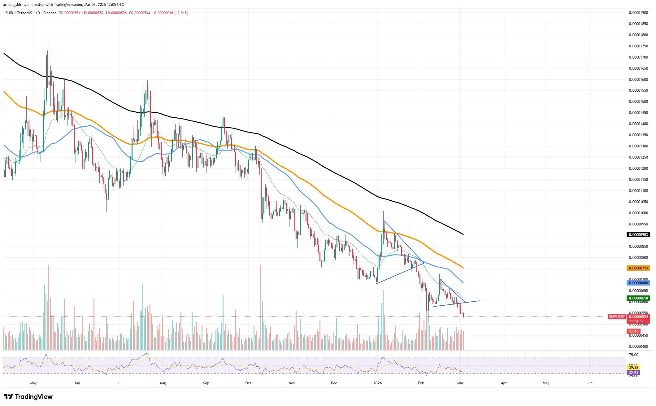 SHIB价格仍低于所有关键移动均线,陷入持续下跌趋势。该资产不断创出更低的高点和低点,每次微弱反弹都遭遇迅速抛售。最新蜡烛图显示下行加速,推动价格探向新低点,强化了整体看跌结构。