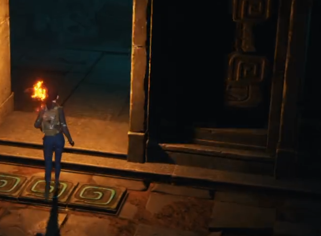 此时场景切换至封闭石室,玩家需依循路径指引快速撤离。正前方可见一处盗洞,经简短交互后即可脱出。随后沿主墓道深入前行,抵达第一道石门时发现其处于闭合状态。解谜起点位于右侧雕像:调整其底座圆盘至指定方位;完成后转至对侧石像,同样校准对应圆盘角度。双机关复位后,石门自动开启。