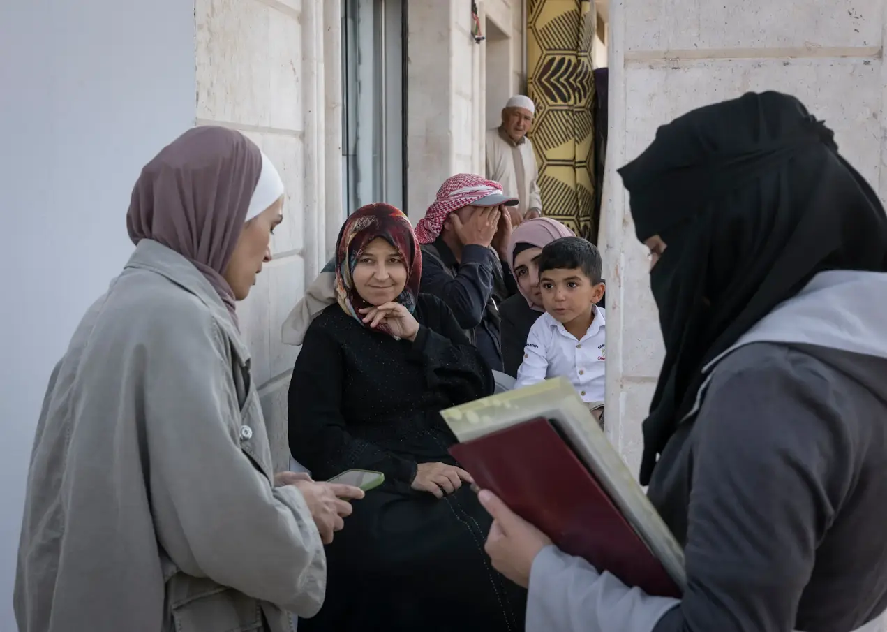 Almahmoud 女士(左二)和她的家人与 Mercy Corps 工作人员在 Halfaya 合影。
