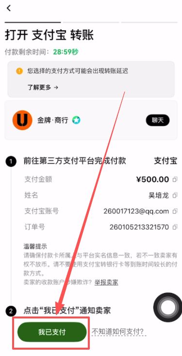 点击“获取付款详情”,你会看到商家的真实姓名和支付宝/银行卡账号。