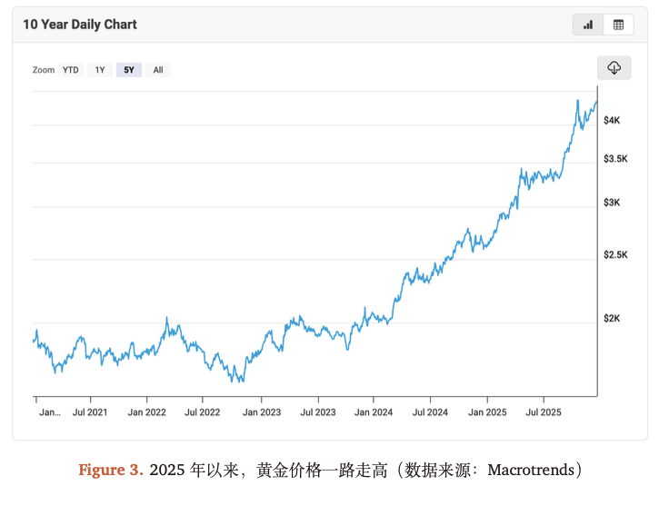 一方面,债务压力与法定货币信用风险均呈上升。随着主要经济体公共债务水平升至历史高位,投资者对主权信用法定货币的信任出现结构性松动。2025 年市场对非债务型资产的需求达到了十年来的高点。