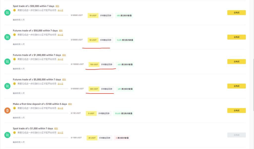 要求在7天内完成,有多项任务,根据充值、现货交易、合约交易的量奖励也不一样,新用户完成100刀不难,资深玩家完成600刀也很简单。