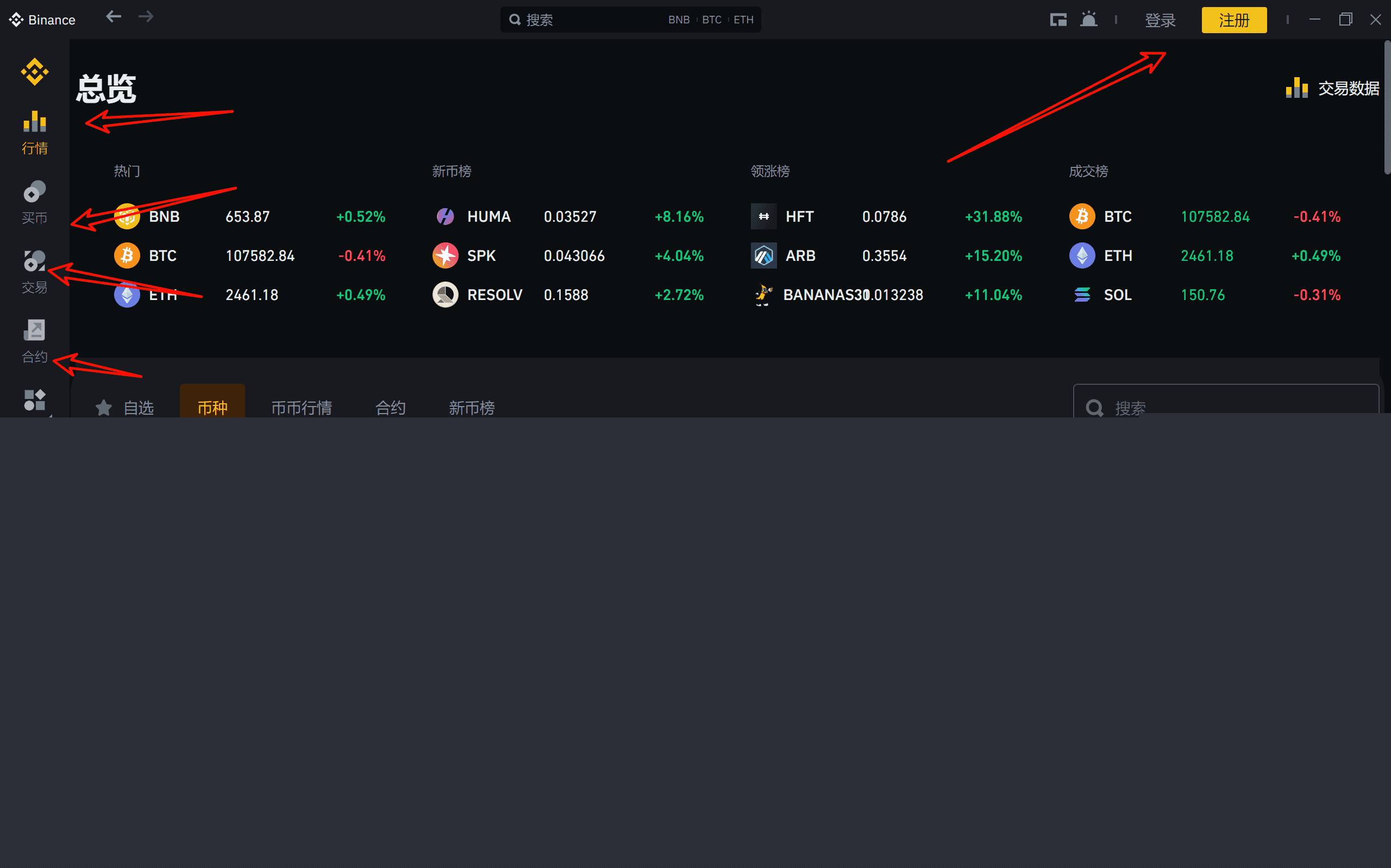 方法三:查看顶部导航栏,“产品”或“交易”菜单下可能包含“币安桌面端”入口。