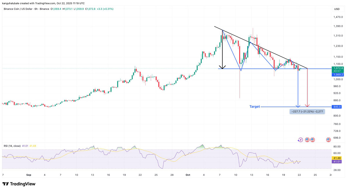 来自Cointelegraph Markets Pro和TradingView的数据显示,BNB在6小时图表上已跌破一个下降三角形形态,如下图所示。