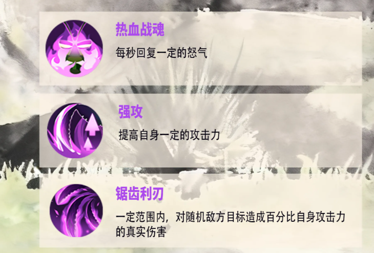 快螳螂核心技能包含三项:被动“热血战魂”提供每秒固定值怒气回复;主动技“强攻”在释放后提升自身攻击力,持续期间可叠加生效;奥义“锯齿利刃”对范围内随机敌方单位造成基于自身攻击力的真实伤害,无视防御与减伤效果。三项技能协同构成短周期高瞬伤体系,特别适用于快速清场或定点斩杀敌方关键输出单位。