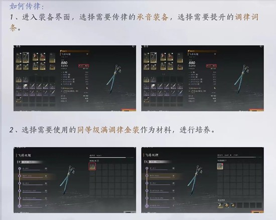 如何承音和调律燕叽说得比较清楚了,总结一下:[用承音石将“传家宝”装备提升到目标等级,之后用同等级满调律金装进行培养,可以成为金词条。]