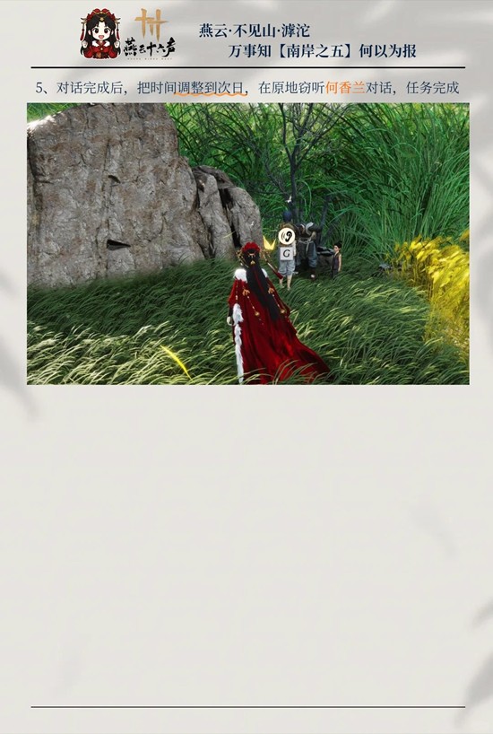 5、对话完成后,把时间调整到次日,在原地窃听何香兰对话,任务完成
