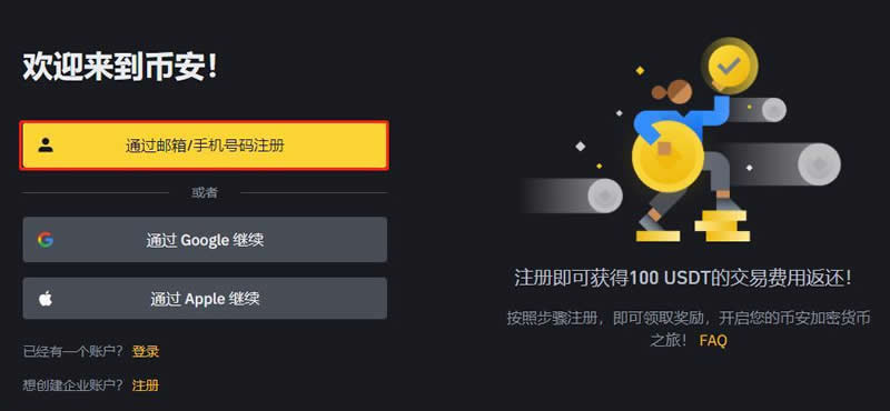 第一步:访问币安官网(),选择页面左侧的邮箱或手机号注册入口