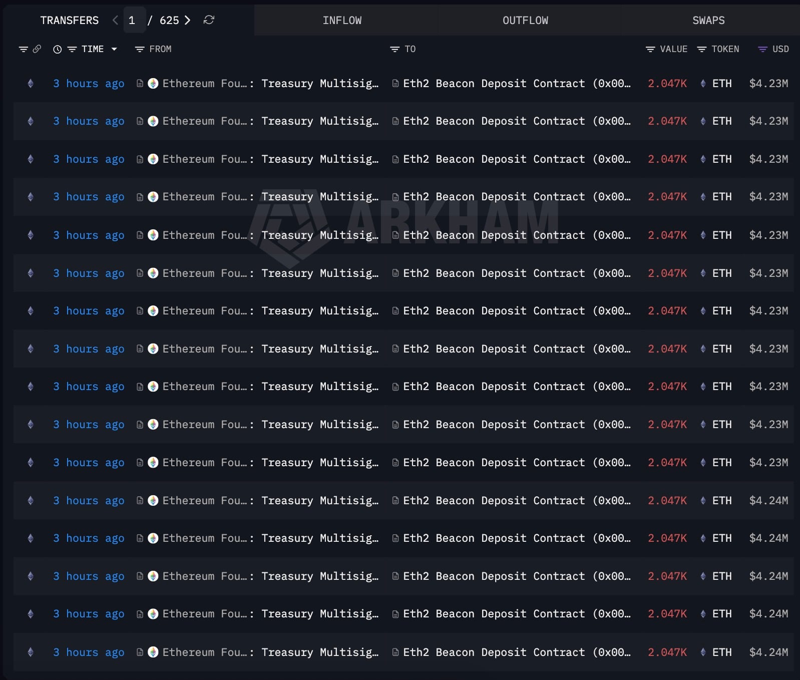 Arkham数据显示,已质押ETH总量达7万枚(价值1.43亿美元)。3月初公布的策略最终阶段于今日完成,交易通过国库多签钱包分批执行至信标链存款合约。