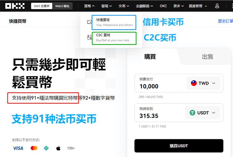 OKX提供信用卡直充和C2C场外交易两种入金方式。前者直接与平台交易,后者与认证商户进行点对点买卖。