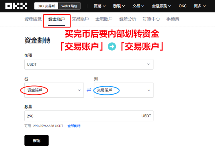 需手动将资金账户中的USDT转入交易账户方可进行币币交易,平台内转账零手续费。
