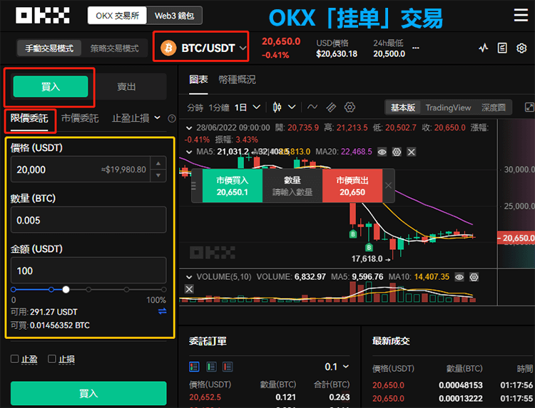 选择"交易"-"基础交易"-"币币"功能,指定BTC/USDT交易对,设置买入价和数量后提交订单,系统自动撮合成交。