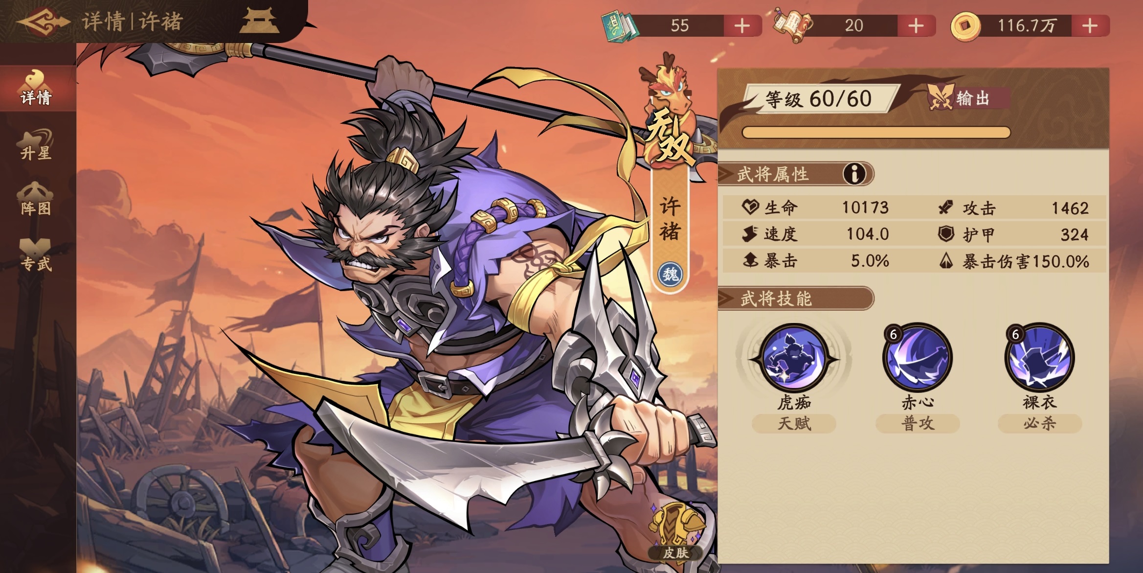 基于上述特性,庞德并非传统意义上的高爆发主C,而更适合作为“战术型副C”使用。在怒气依赖型对手密集的关卡(如特定Boss战或PVP高配阵容对抗)中,其压制效果尤为显著。若队伍中缺乏稳定怒气封锁手段,庞德可作为关键替补上场。推荐搭配许褚组成双输出轴:许褚开启大招后不仅自身普攻伤害提升,还能强化同排友军普攻,使庞德的三段攻击在增益下更具威胁性。