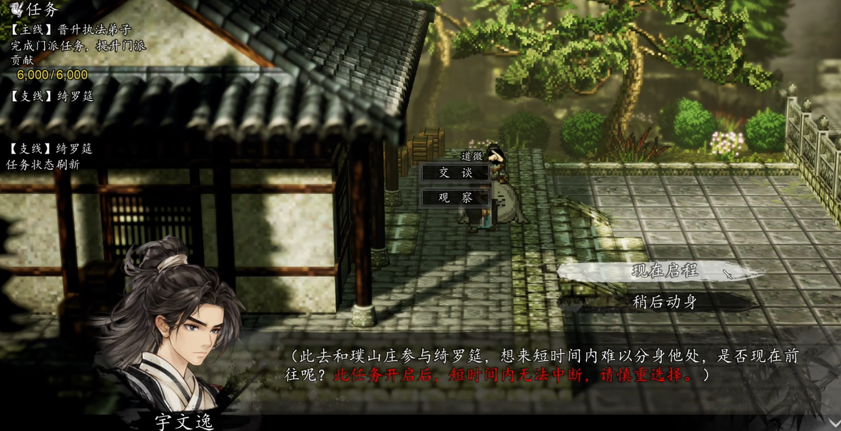 真相查明后返回厢房区域,仍有若干遗漏内容需补全。首先进入西厢房,可向苦老赠送礼物或发起切磋,完成后获取【极品血灵丹丹方】与【上品烈阳丹丹方】,并开放技能请教功能;随后前往东厢房触发专属剧情。全部就绪后,选择【休息至夜晚】,正式开启夜间战斗序列。