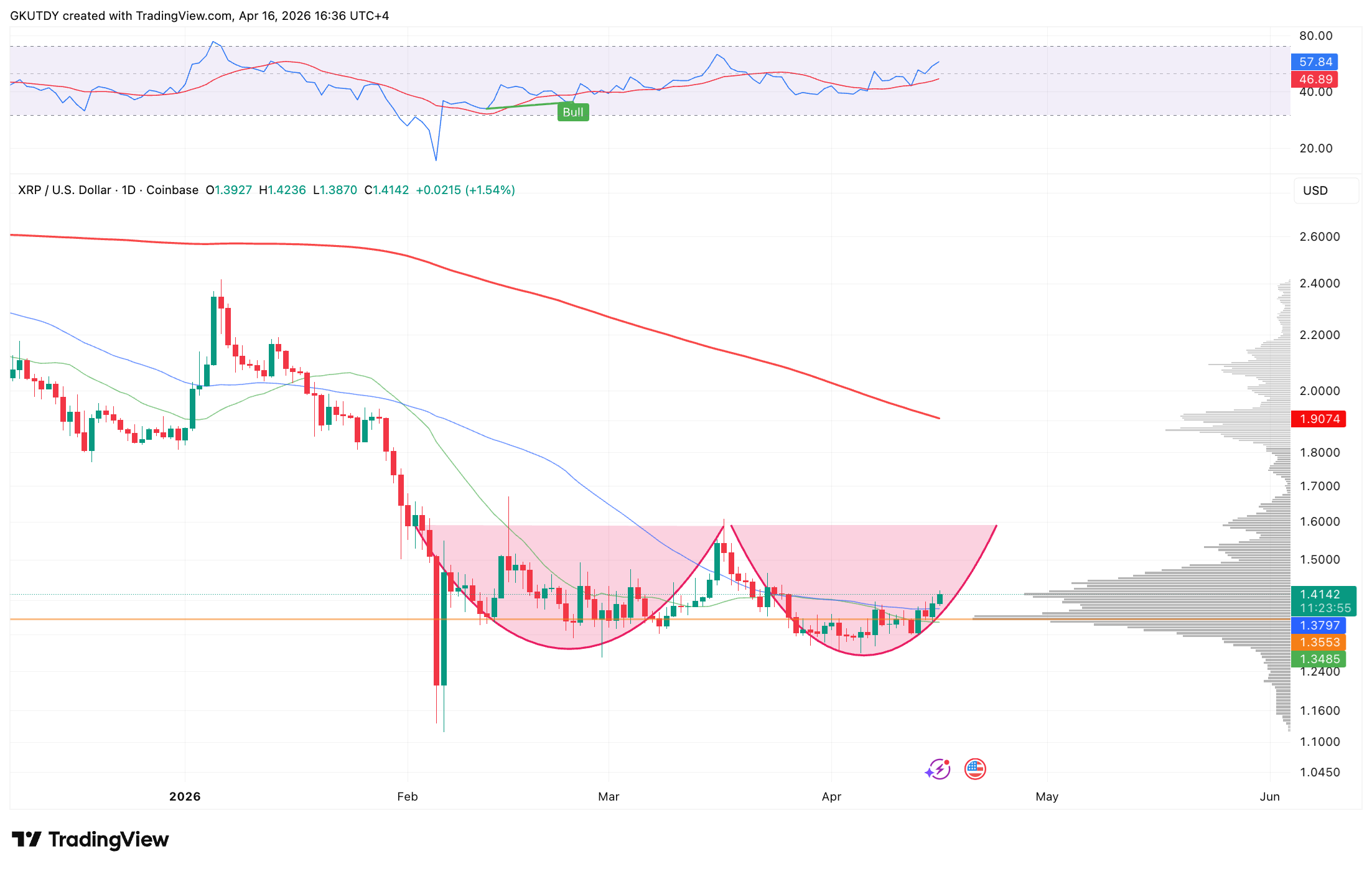 据TradingView图表显示,在1.34-1.40美元区间盘整后,XRP正逼近1.55美元关键颈线位。根据技术分析法则,有效突破将打开相当于形态高度的上行空间。