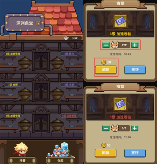 可以消耗金币刷新道具类型和等级,金币消耗数量随刷新次数而提升,高级奖励道具还通过分配多名【宠物】合作烹饪来减少烹饪时间。