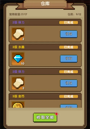 在食堂烹饪完成的奖励会自动存入右下角的【仓库】中,每位玩家初始仓库都可以储存12次烹饪完成的奖励道具,请及时领取保持食堂运转。
