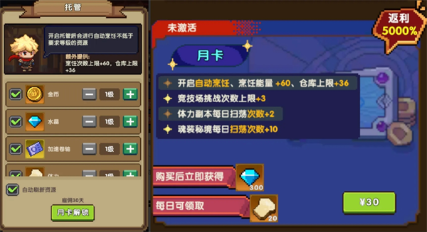 自动烹饪:能够设置最低奖励限制(如:只做4级以上),开启托管后会自动烹饪不低于要求等级的资源