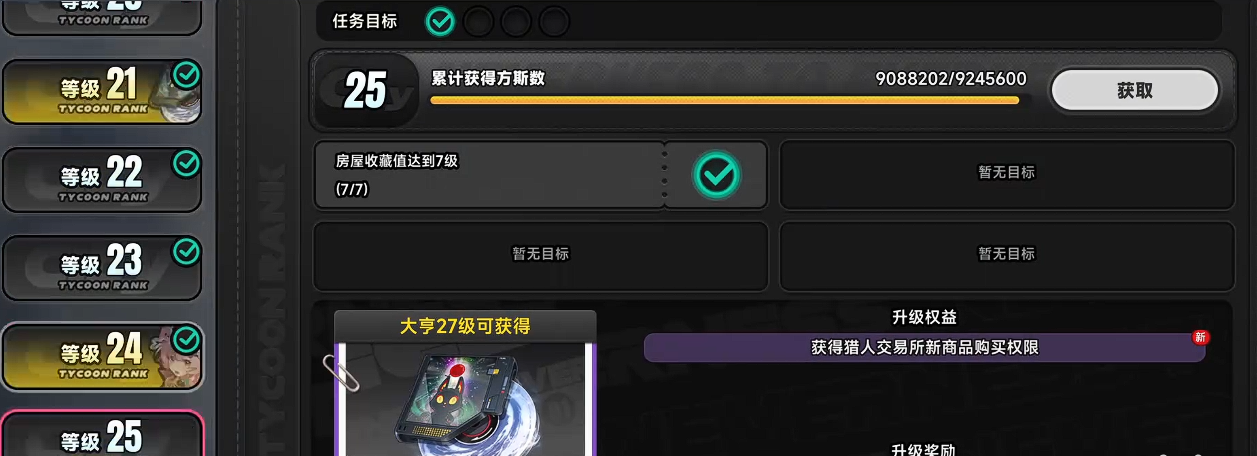 都市大亨共设多级成长体系,每一级均对应一项专属权限解锁。升级条件由两部分构成:一是基础货币“方斯”累计达标,二是完成特定维度的指定任务。例如,达到25级需满足“房屋收藏等级≥7”,即玩家须在大世界地图中购置并持有至少7级品质的房产;而所有等级任务均以“方斯”为底层资源支撑。该货币可通过主线剧情、支线委托、限时活动、体力消耗返还等多种常规途径稳定获取,前期资源积累效率较高。