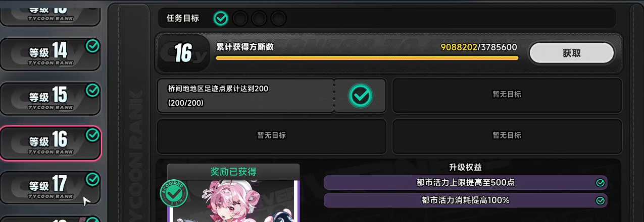 值得注意的是,等级跃迁存在关键分水岭:16级为重要效率拐点。突破该等级后,方斯基础产出将获得倍率加成,整体资源转化效率实现质变。而达成16级门槛的操作难度较低——仅需在城市内完成基础载具配置(如购置3台以上不同型号载具)并收购若干初始房产即可满足全部前置条件,适合集中资源快速突破。