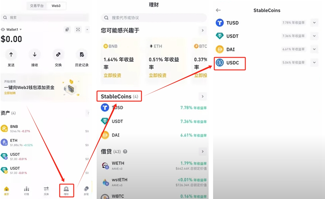 理财模块重点关注稳定币收益机会,其中USDC因严格的审计流程备受推荐。