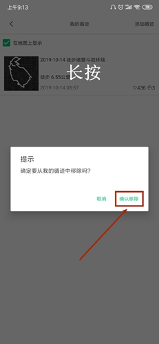 2、然后我们就能看到我们的一系列循迹数据了,很多用户们还是找不到删除的按键,其实只要我们长按一个我们想要删除的循迹路线,就会出来一个询问是否删除的界面,点击确认删除即可。