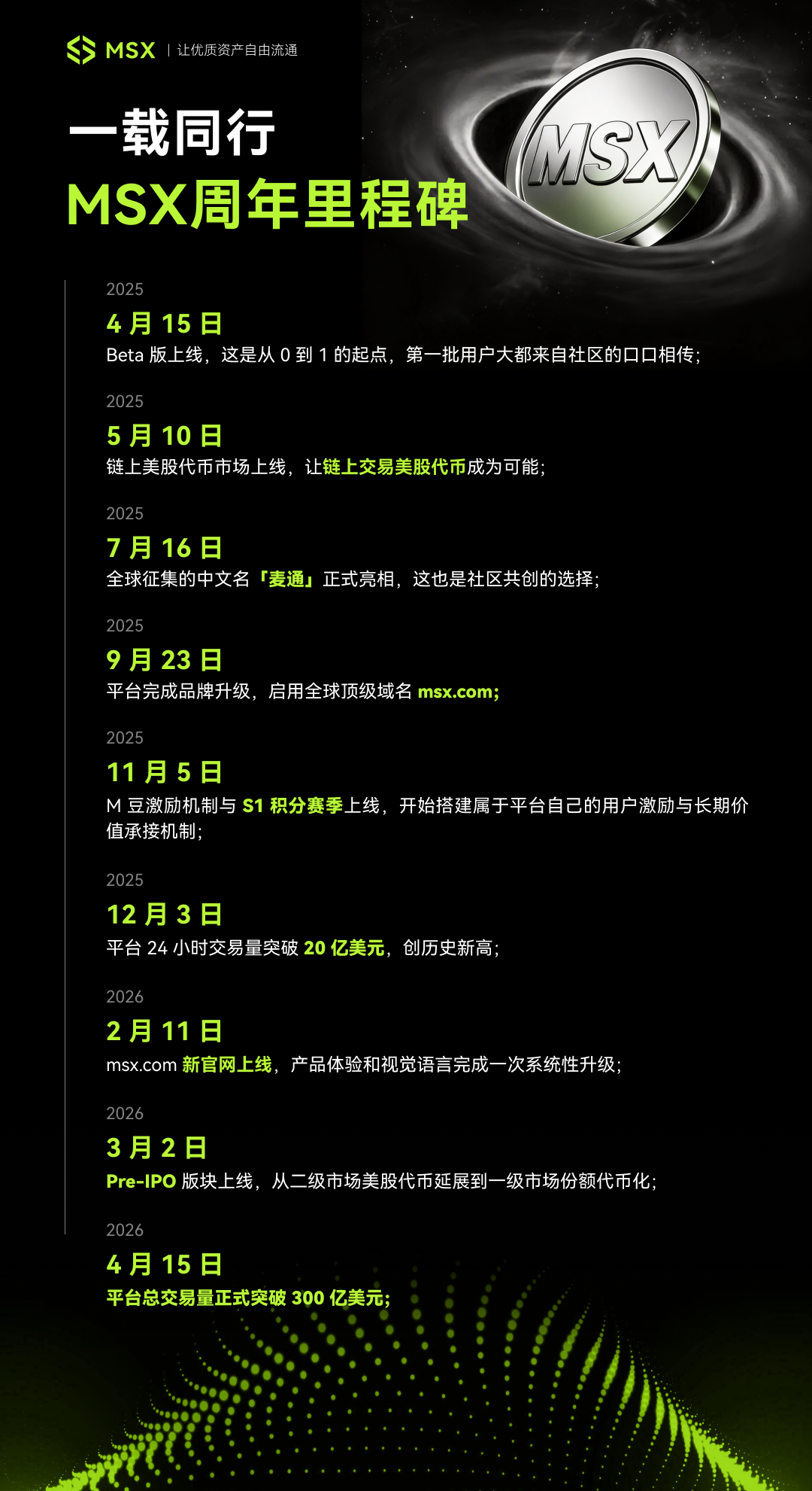 截至 2026 年 4 月 15 日,麦通 MSX 的平台累计交易量已突破 300 亿美元,注册用户超过 18 万,支持 300+ RWA 交易标的,围绕这一基础,平台已形成覆盖美股现货与合约、Pre-IPO 区、麦点研究院与币币交易等在内的多元产品矩阵。