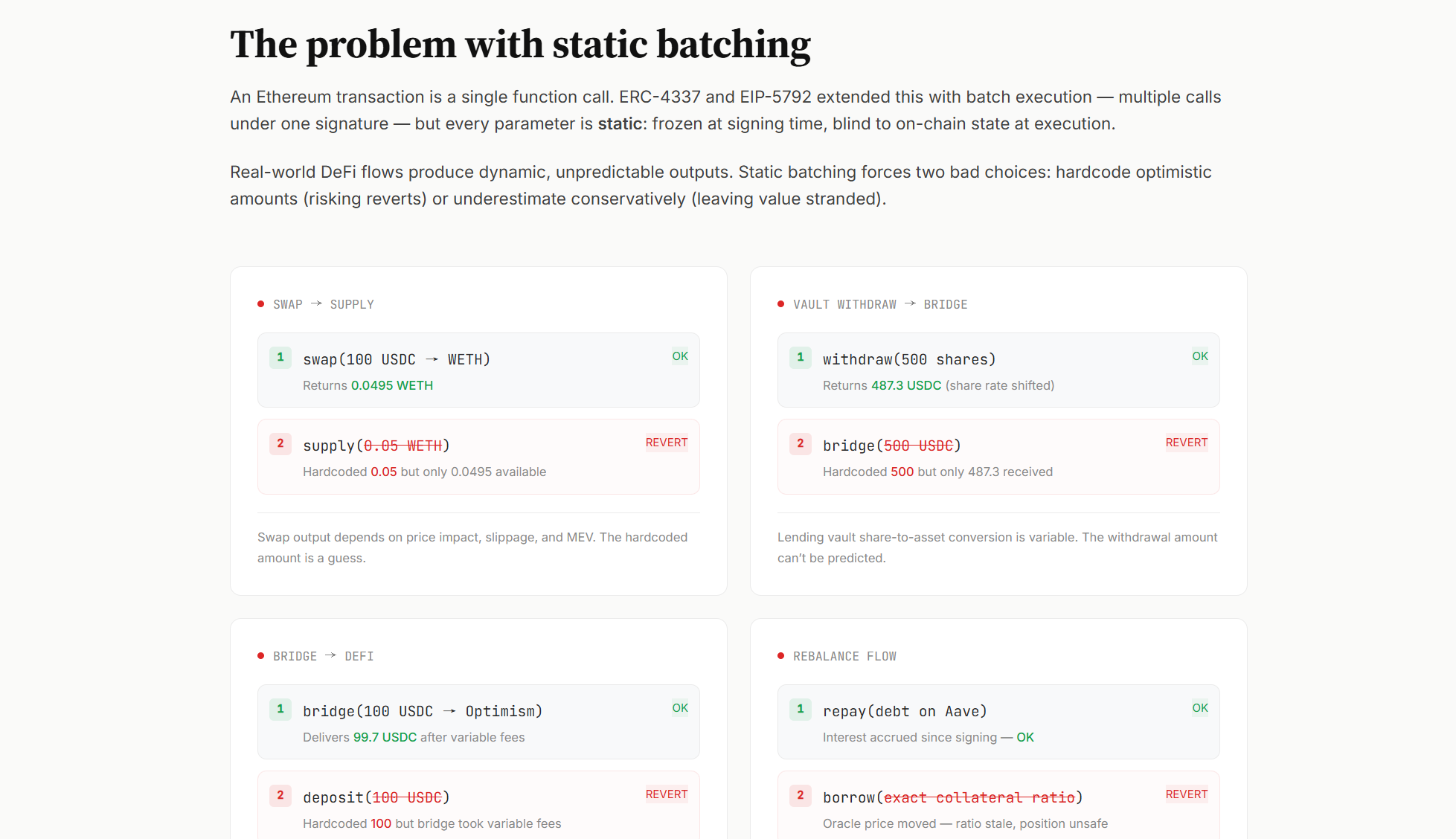 在现有静态 batch 处理模型下,Agent 必须在签名前预估 Swap 之后会拿到多少 USDC,往往迫使你在签名时提前写死第二步的输入晶额,且估得太高,真实到账数字不够,整个批次直接回滚;估得太低,又会留下一部分资金闲置在钱袋里做不了事。